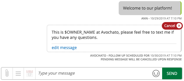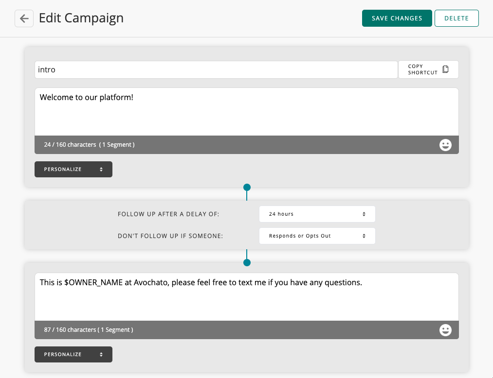 Blog › How To: Make a Drip Campaign How To: Make a Drip Campaign Avochato Product In this tutorial, we'll walk through how to create a simple drip campaign. If you'd like to have campaigns enabled, please reach out to your Avochato sales representative today. Let's start with the intended behavior: when a new customer signs up for your platform, you'd like to send them an initial message that says "Welcome to our platform!" This is a good way to help customers understand that they'll receive texts from your company. The next day, maybe you'd like to send a more personalized note from one of your agents to make yourself available for questions. This might say, "This is Alex at Avochato, please feel free to text me if you have any questions." You can set up this campaign quickly and easily by going to Avochato's new "Campaigns" tab, and creating a new campaign. We'll reference the name for the campaign later when you start sending it. We'll call this campaign "intro" and type in the message that we mentioned previously. For the follow-up message, you can easily personalize your messages to include the name of the agent who will be chatting with this customer by using the variable "Owner Name." Additionally, you can configure the follow up message to be scheduled 24 hours after the initial message, as described before. However, if the customer responds with a question between then, we'll cancel the follow up automatically. This helps ensure that all messages to the customer are timely and relevant. Once the campaign has been saved, you can easily copy the automatically generated shortcut ($campaign_intro) and start sending it. Just like a template or a variable, whenever you send $campaign_intro from Avochato, the first message will be sent and the follow up message will be scheduled automatically. For example, you might incorporate this campaign into your company's auto-response, so that people who text in for the first time are automatically enrolled. Alternatively, if you already have a list of users who need to be contacted, you could send a campaign through a broadcast message and initiate the campaign that way. Check out more ways to send a campaign here. If you're using campaigns to contact customers automatically, we highly recommend that you enable Avochato's office hours in order to ensure that you're only chatting at times that are convenient for your customer and for your team. Make sure that you have enabled the setting to keep campaigns within office hours from your Conversation Management page. If you have a question or an interesting use case for campaigns, reach out and let us know!